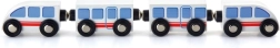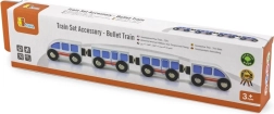 Der Schnellzug ergänzt die meisten Holzeisenbahnen perfekt und erweitert die Spielmöglichkeiten um eine moderne, von Hochgeschwindigkeitszügen inspirierte Garnitur.