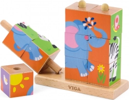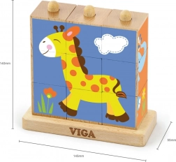 Die Viga Safari-Steckwürfel sind ein zeitloses Spielzeug, das Kinder spielerisch zum Lernen anregt. Neun glatt geschliffene Würfel auf einer stabilen Basis ermöglichen das Zusammenstellen von vier bunten Tiermotiven. Dank der kippbaren Stifte lassen sich die Würfel leicht drehen, sodass Kinder schneller das richtige Teil finden.