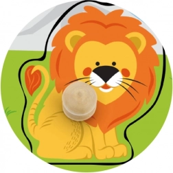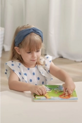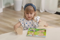 Die stabile Holzgrundplatte mit eingefrästen Rändern sorgt dafür, dass die Teile gut sitzen, und unterstützt zugleich das Formverständnis, die Geduld und das logische Denken. Das Puzzle ist ideal für das erste Kennenlernen von Tieren und die Sprachentwicklung.