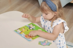 Unter jedem Puzzleteil befindet sich ein Bild zur einfachen Zuordnung. Kinder üben ganz natürlich das Erkennen von Formen und Tieren.