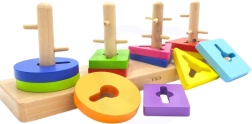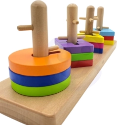 Durch das Zusammenstellen verschiedener Formen auf Holzstiften unterstützt das Spielzeug die Entwicklung der Feinmotorik und der Hand-Auge-Koordination.