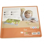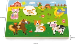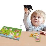 Holzpuzzle mit Tieren und Sound. Beim Einsetzen des richtigen Tieres ertönt das entsprechende Tiergeräusch. Größe der Platte ca. 30 × 22,5 × 2 cm. Stromversorgung 2 × AAA-Batterien (nicht enthalten). Verpackungsmaße ca. 30 × 27 × 2 cm. Alter 18 Monate+