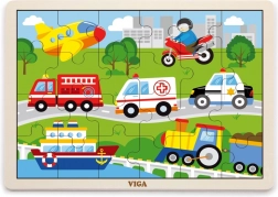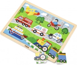 Dieses Holzpuzzle mit Abbildungen von Verkehrsmitteln ist eine hervorragende Wahl als erstes „größeres“ Puzzle. Mit 24 Teilen bietet es genau die richtige Herausforderung – es unterstützt die Konzentration und die Freude am fertigen Bild mit den Maßen ca. 27,5 × 20 cm. Farbige Illustrationen von Fahrzeugen (Krankenwagen, Feuerwehrauto, Polizeiwagen, Schiff, Flugzeug u. a.) motivieren Kinder ganz natürlich zum wiederholten Spielen.