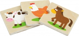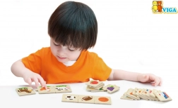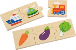 Die Holzpuzzles Logik von VIGA verbinden Spiel und Lernen. Kinder setzen 24 Teile zu 8 sinnvollen Trios zusammen – zum Beispiel drei Tiere, drei Fahrzeuge oder drei Gemüsesorten. So trainieren sie auf natürliche Weise das Erkennen von Kategorien, die Konzentration und den Wortschatz.