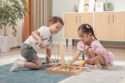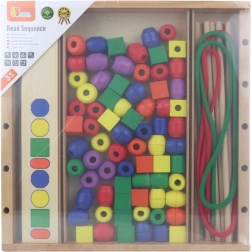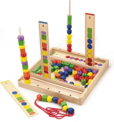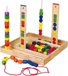 Kinder stapeln und fädeln Perlen auf Stäbchen in der von den Karten vorgegebenen Reihenfolge. Sie trainieren Hand-Auge-Koordination, Geduld sowie das Erkennen von Farben und Formen.