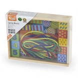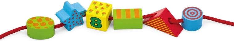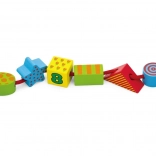 Dieses Holz-Fädelset bietet Kindern unendliche Gestaltungsmöglichkeiten: Auffädeln wie Perlen, Bauen von Türmen und Häuschen oder Sortieren nach Farben und Formen. Große Teile (ca. 4 cm) liegen gut in der Hand und sind ideal für erste motorische Übungen.