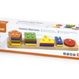 Das Set enthält kräftig gefärbte geometrische Teile, die Kinder leicht greifen und nach Form und Farbe sortieren können.