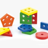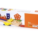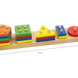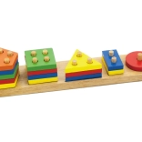 Dieses robuste Holz-Steckspiel kombiniert das Sortieren und Auffädeln von Formen auf Stifte. Kinder lernen, Farben und geometrische Formen zu unterscheiden, trainieren die Hand-Auge-Koordination und verbessern die Geschicklichkeit beim Greifen und Platzieren der Teile. Das Holz ist glatt geschliffen, die Farben sind kräftig und ansprechend.
