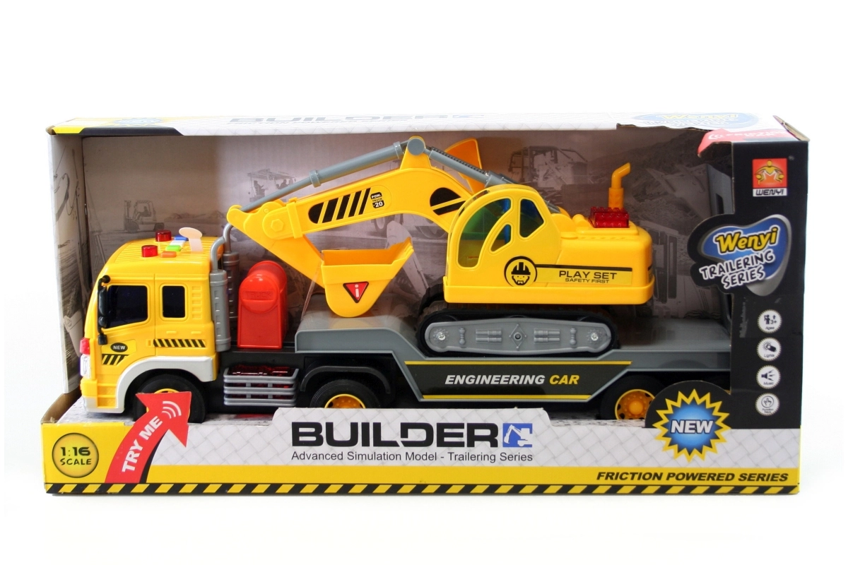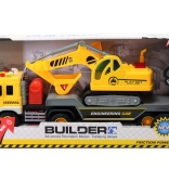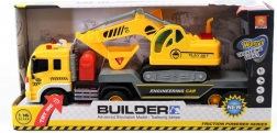 Entdecken Sie ein actionreiches Bauset, das jeden kleinen Technikfan begeistert. Der große Sattelschlepper mit funktionaler klappbarer Rampe transportiert den beiliegenden Bagger sicher zu jeder Kinderbaustelle. Beim Drücken der vier Tasten auf der Motorhaube gibt der Sattelschlepper Soundeffekte und Lichtsignale aus, die das realistische Spielerlebnis verstärken.