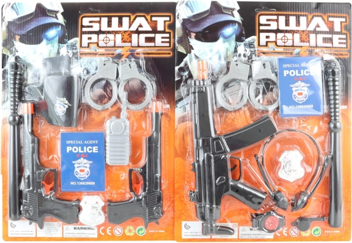 Polizei-Set für Kinder mit Schlagstock, Handschellen, Abzeichen und Spielzeugwaffen. Umfangreiches Zubehör, Verpackungsmaße 42,5 × 31,5 × 4 cm. Alter 3+.