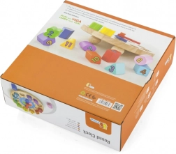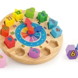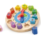 Die Uhr hat kompakte Maße von etwa 22 × 6 cm und im Set finden Sie 12 verschiedene Formen in kräftigen Farben mit aufgedruckten Zahlen. Ein großartiger Helfer für die erste Begegnung mit der Zeit sowie für die Förderung von Geduld und Konzentration.