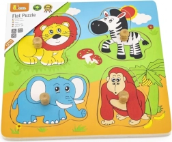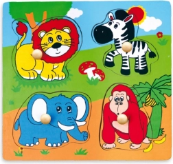 Dieses hochwertige Holz-Steckpuzzle mit Safari-Motiv ist ein ideales erstes Puzzle für Kleinkinder. Jedes Teil verfügt über einen Holzknopf für ein leichtes Greifen mit kleinen Händen und eine passende Silhouette auf der Grundplatte für bessere Orientierung.