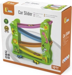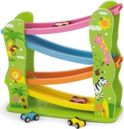 Holzrutsche für Autos ist ein ideales Spielzeug für Kleinkinder, das Spaß bietet und die motorischen Fähigkeiten fördert. Geeignet für Kinder ab 18 Monaten.