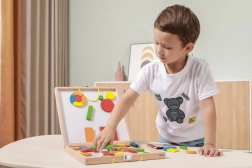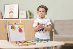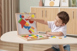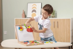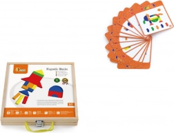 Im Set enthalten sind 42 magnetische Holzteile in verschiedenen Formen und Farben sowie 12 beidseitige Karten mit insgesamt 24 einfallsreichen Vorlagen für einen leichten Einstieg. Beim Spielen trainieren Kinder die Feinmotorik, die Augen–Hand-Koordination, das Erkennen von Farben und Formen sowie das räumliche Vorstellungsvermögen.