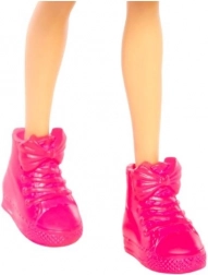 Gerika hat lange rosablonde Haare, ein fröhliches Outfit mit Tiermotiven und auffällige pinke Schuhe für einen modischen Look.