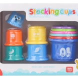 Kunststoff-Faltbecher. Enthält 11 Becher in verschiedenen Farben und Größen. Verpackungsmaße ca. 26 × 18,5 × 9 cm. Alter 6 Monate+