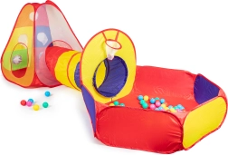 Verwandeln Sie das Kinderzimmer oder den Garten in einen bunten Spielplatz. Das IPLAY-Spielzelt vereint Zelt, Tunnel und Trocken-Ballbecken zu einer großen Spielstrecke, die Motorik, Koordination und Zielgenauigkeit fördert. Kinder können auf 5 bunte Zielscheiben werfen, das Werfen in den Korb trainieren und sich im Ballbecken sicher austoben.
