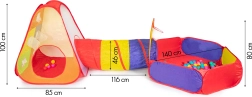 Das große Set (ca. 300 × 120 × 100 cm) schafft einen bunten Bereich zum Durchkrabbeln, Verstecken und Bällewerfen. Ideal für Geschwister und Freunde.