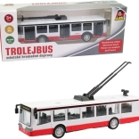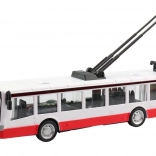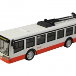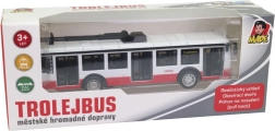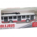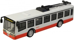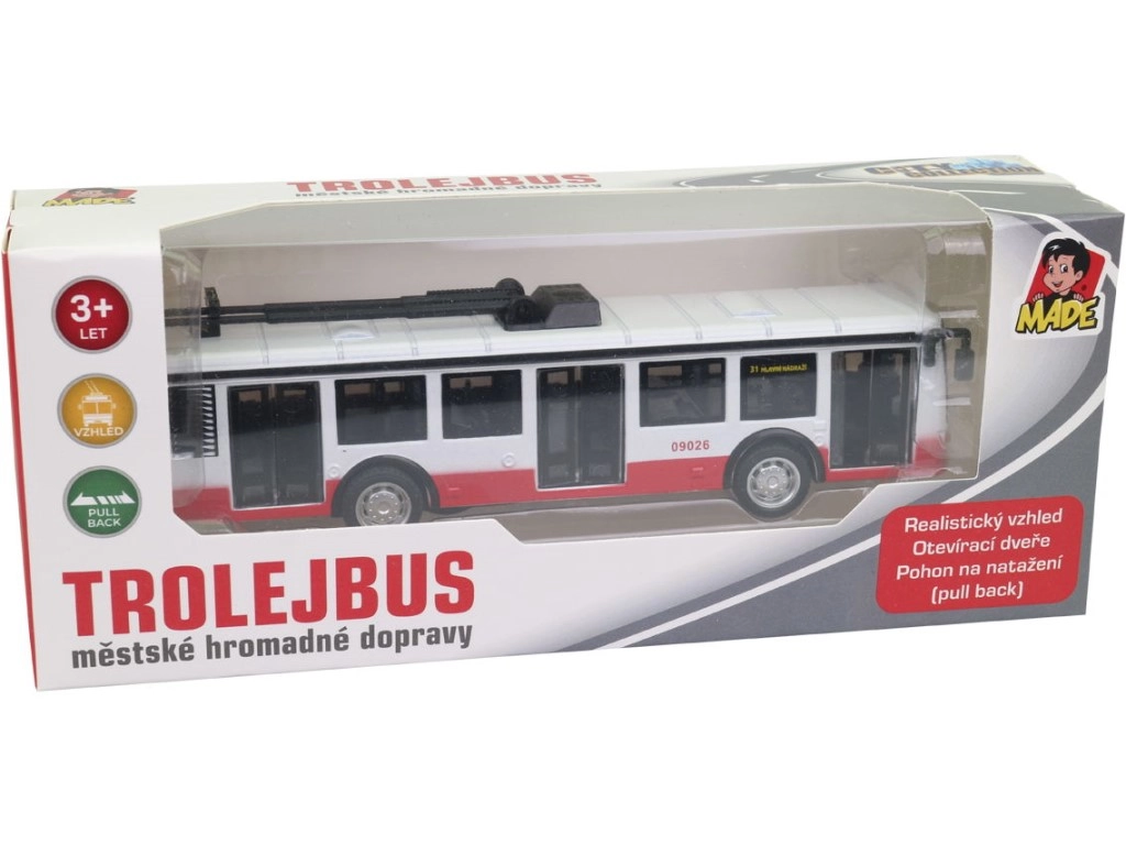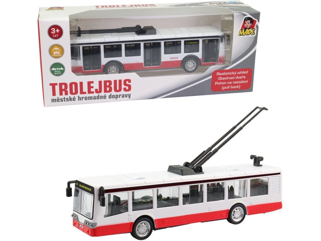 Entdecken Sie einen detailreich gestalteten Trolleybus in der klassischen rot-weiß-schwarzen Farbkombination, wie man sie aus einigen tschechischen Städten kennt. Das Modell ist aus hochwertigem Metall mit Kunststoffteilen gefertigt und liegt dadurch stabil und leicht in Kinderhänden. Dank des Rückzieh-Antriebs fährt der Trolleybus nach dem Loslassen von allein los und sorgt für viel Spielspaß.