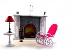Kunststoffkamin, Kerzenhalter, Bild, Uhr, Schaukelstuhl, Tisch mit Lampe, Ständer mit Kaminwerkzeug