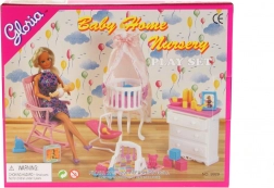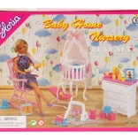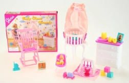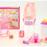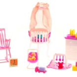 Dieses umfangreich ausgestattete Set verwandelt jedes Spiel in ein realistisches Erlebnis. Kinder können ihre eigene Babyecke einrichten, Kleinigkeiten in der Kommode verstauen, das Baby in das Himmelbett legen und im stilvollen Stuhl schaukeln. Das Set fördert kreatives Spiel, die Feinmotorik und Rollenspiele.