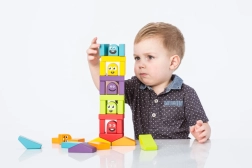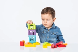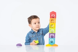 Stapeln und Bauen von Türmen aus bunten Teilen trainiert die Feinmotorik und Koordination und regt zugleich die Fantasie und freies Spiel an.