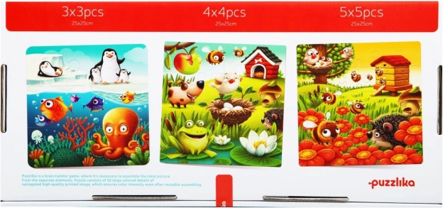 Entdecken Sie spielerisches Lernen mit dem Puzzlika-Puzzle Lieblingstiere 3-in-1. Die Packung enthält insgesamt 50 große Teile, aus denen Kinder 3 separate Bilder à 25 × 25 cm mit unterschiedlichem Schwierigkeitsgrad (3×3, 4×4, 5×5) zusammensetzen. Dank der vielfältigen Tiermotive und kräftigen Farben ist das Puzzeln attraktiv und motivierend für Vorschulkinder.