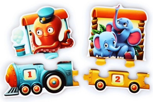 Dieses farbenfrohe Lernpuzzle wurde für freudiges Lernen durch Spielen entworfen. Jeder Waggon besteht aus zwei Teilen – eines zeigt die Illustration einer Tiergruppe, das andere die passende Ziffer. So verstehen Kinder leicht das Prinzip des Zuordnens und die Reihenfolge der Zahlen.