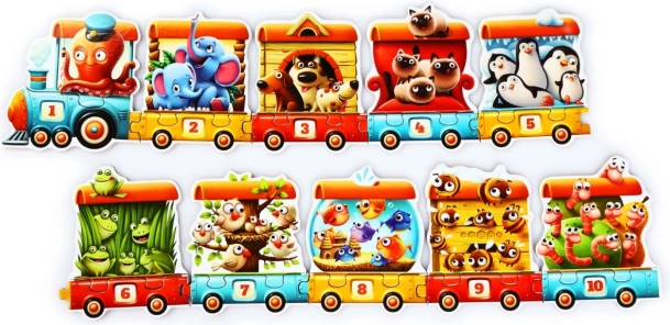 Jeder Waggon kombiniert eine Tiergruppe mit der passenden Ziffer. Kinder üben das Zählen und die richtige Reihenfolge.