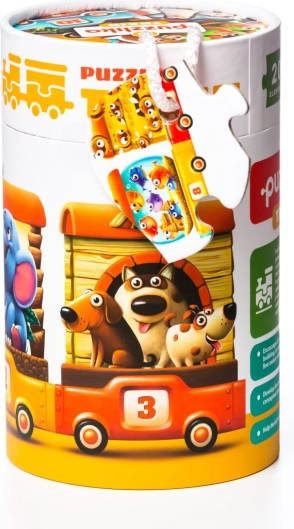 Das unterhaltsame und lehrreiche Puzzle Puzzlika Zug für die Kleinsten hilft Kindern, Zahlen von 1–10 zu lernen, Tiere zu erkennen und logisches Denken sowie Feinmotorik zu trainieren. Aus 20 stabilen Teilen entsteht ein 94 cm langer Zug mit Lokomotive und Waggons, bei dem jeder Anzahl von Tieren die passende Ziffer entspricht.