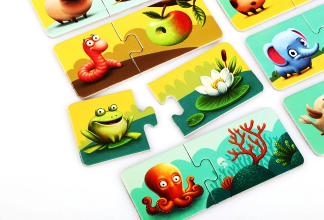 Das unterhaltsame Set Puzzlika Mein Zuhause bringt Kindern bei, Tiere mit ihren Lebensräumen zu verbinden. Es enthält 20 große, stabile Teile, die 10 Paare bilden. Fördert logisches Denken, Feinmotorik, Erkennen von Tieren und Umgebungen sowie visuelle Wahrnehmung. Hergestellt aus robuster, mehrschichtiger Pappe mit glänzender Oberfläche, leicht zu reinigen und ideal für Vorschulkinder.