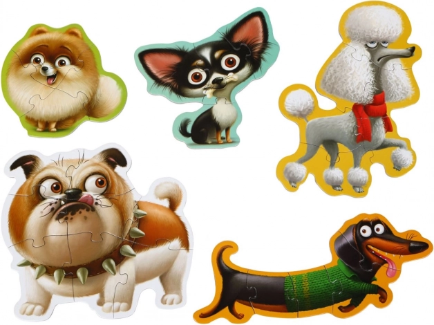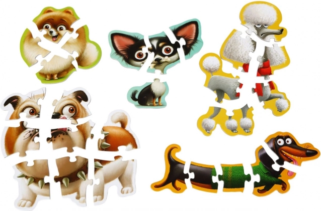 Dieses Puzzlika-Set für Kinder enthält 5 niedliche Hundebilder, die aus unterschiedlich anspruchsvollen Teilen (4–8 pro Bild) zusammengesetzt werden. Dank der großen und festen Teile liegen die Puzzles hervorragend in kleinen Händen und fördern Konzentration sowie Geduld.