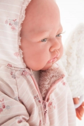Fein ausgearbeitete Härchen, Äderchen, Nägelchen und Augenbrauen erzeugen das authentische Aussehen eines Neugeborenen. Die spezielle Hautgestaltung wirkt natürlich und fühlt sich sanft an.