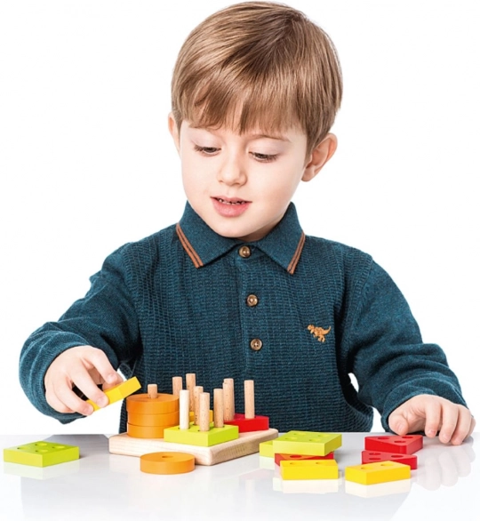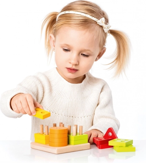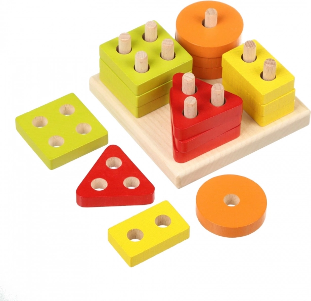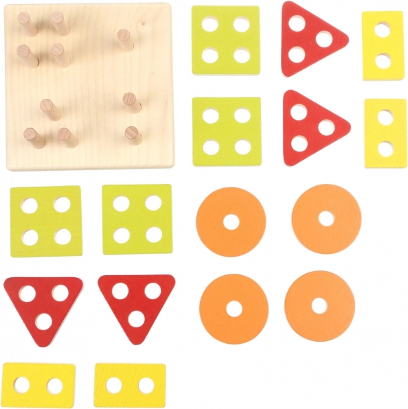 Bunte Kreise, Quadrate, Dreiecke und Rechtecke mit Öffnungen werden auf die Stifte der Basis gesteckt. So sortieren Kinder ganz natürlich nach Form und Farbe und trainieren ihr logisches Denken.