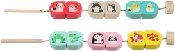Das Auffädeln der Holzstücke gelingt dank des Stifts an der Schnur leichter. Kinder trainieren Griff, Genauigkeit und Geduld beim Zusammensetzen der Tierpaare.