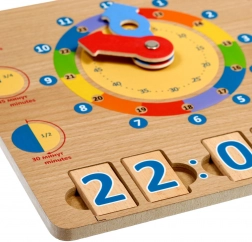 Enthalten sind 14 Zahlenblöcke und 6 Bildblöcke mit Tagesaktivitäten. Vier Zeitblöcke können in vorbereitete Schlitze eingesetzt werden, um eine digitale Uhrzeit zu bilden, während der fünfte Block die entsprechende Aktivität darstellt. So verknüpfen Kinder die analoge Uhr visuell mit der digitalen Darstellung und dem gewohnten Tagesablauf.