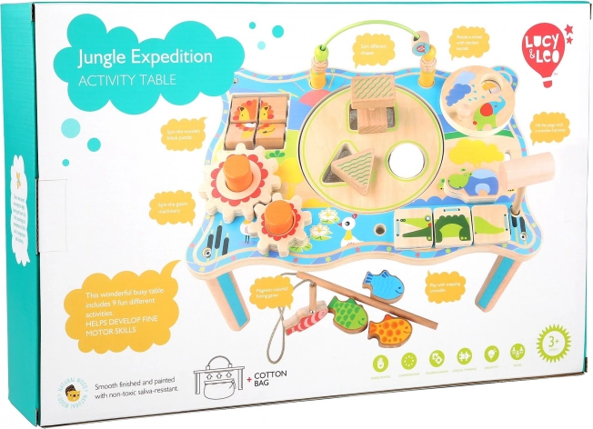 Der Holztisch mit Dschungelmotiven verbindet Spaß mit Lernen und fördert Feinmotorik, Hand-Auge-Koordination und logisches Denken. Kinder können Zahnräder drehen, Perlen auf der Bahn schieben, mit der Klopfbank Kraft und Konzentration trainieren und durch das Steckspiel die Formenwahrnehmung üben. In der Mitte befindet sich ein Leinenbeutel für geangelte Fische und Spielteile, der die Spielfläche ordentlich hält.