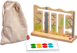 Dieses hochwertige Holzspiel bietet intuitives Schieben bunter Tier-Stifte in eingefrästen Bahnen. Dank der 6 zweiseitigen Karten mit Vorlagen trainieren Kinder die Auge-Hand-Koordination, Geduld und Konzentration. Nach dem Spielen lassen sich alle Teile einfach in einem Leinenbeutel verstauen.
