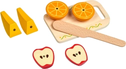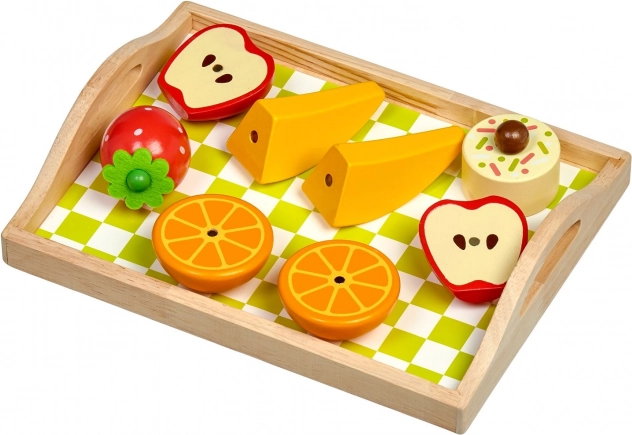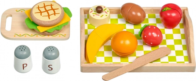 Das Set enthält alles für kleine Köchinnen und Köche: ein Tablett mit Karomuster, ein Schneidebrett, ein Messer, Salz- und Pfefferstreuer sowie eine bunte Auswahl an Lebensmitteln – Backwaren, Käse und Salat, Ei, Banane, Apfel, Orange, Erdbeere und ein kleines Törtchen. Der Fokus auf hochwertige Materialien und robuste Ausführung garantiert Langlebigkeit und sicheres Spiel.