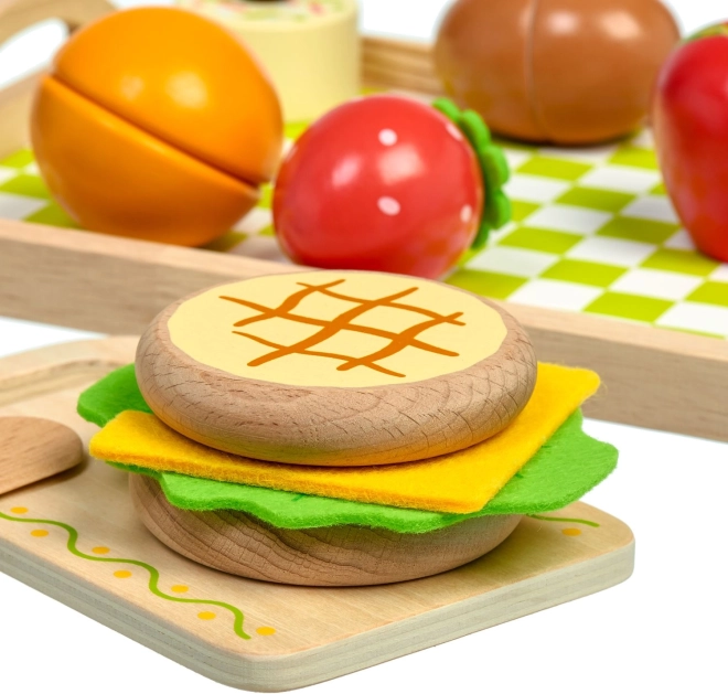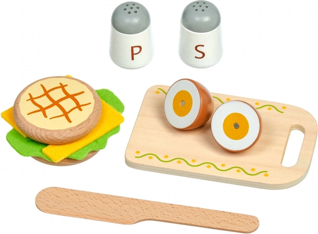 Stabile Holzteile werden durch textile Scheiben von Käse und Salat ergänzt. Robuste Ausführung und satte Farben sorgen für langen und sicheren Spielspaß.