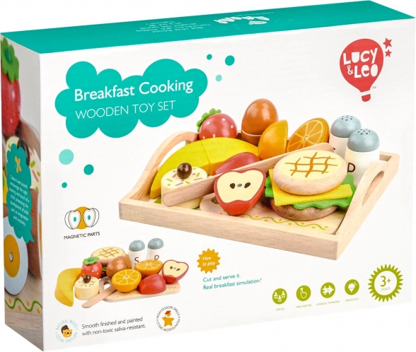 Dieses hölzerne Spielset bildet ein reichhaltiges Frühstück auf einem Tablett naturgetreu nach und lädt Kinder zu endloser Fantasie ein. Die einzelnen Lebensmittelstücke sind mit Magneten verbunden, sodass Kinder sie mit dem Holzmesser auf dem Schneidebrett immer wieder „schneiden“ und neu zusammensetzen können. Das unterstützt natürliches Lernen, Hand-Auge-Koordination und das Nachahmen von Tätigkeiten der Erwachsenen.