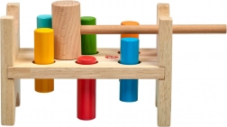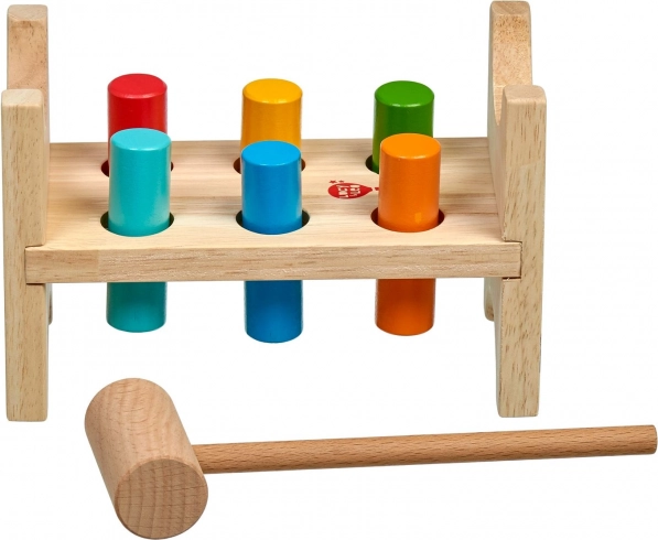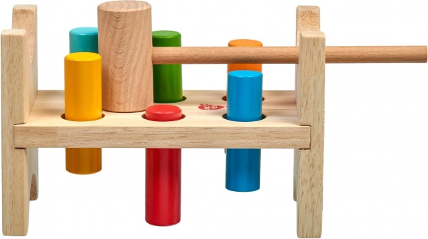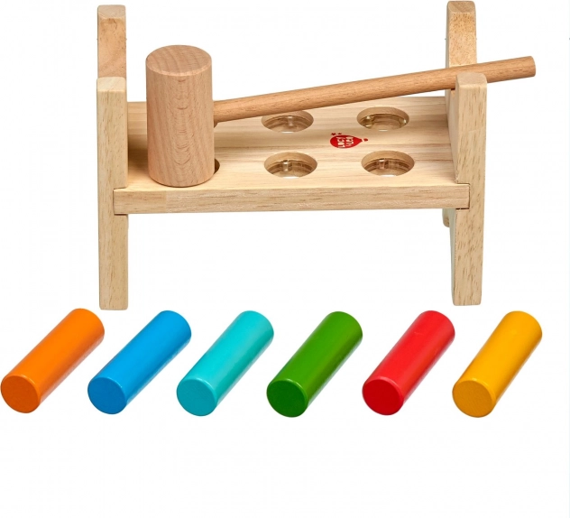 Sechs farbige Stifte und ein Holzhammer schulen den präzisen Griff, die Schlagkraft und die Hand-Auge-Koordination.