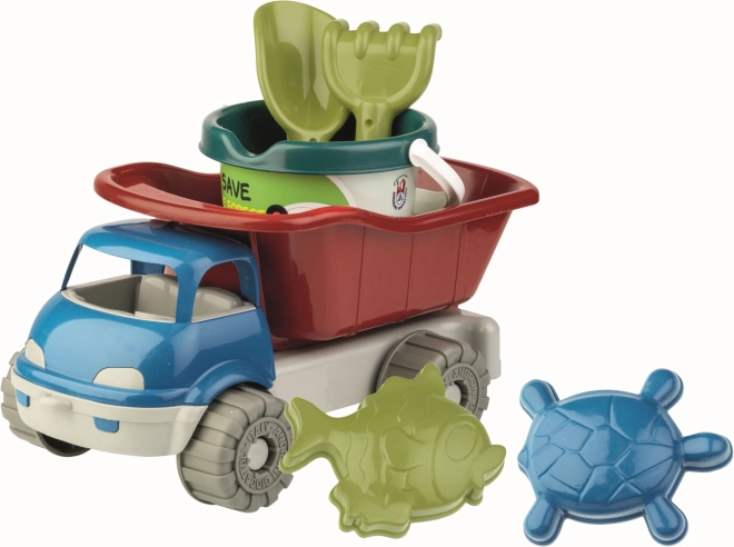 Set enthält Auto, Eimer, Schaufel, Harke und zwei Formen.