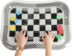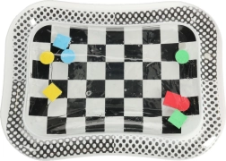 Entdecken Sie die kontrastreiche Wasser-Spielmatte, die nicht nur Ihr Kind fasziniert, sondern auch seine sensorische und motorische Entwicklung fördert. Diese Matte mit schwarz-weißem Schachbrettmuster enthält schwimmende bunte geometrische Formen, die sich bei Berührung des Kindes bewegen.
