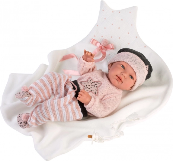 Gönnen Sie Ihrer Puppe eine neue Garderobe mit dem LLORENS Set, das durch zartes Design und angenehmen Tragekomfort überzeugt. Das Outfit mit Punkte-/Streifendesign wirkt realistisch und harmoniert wunderbar mit der passenden Decke. Ideal zum Spielen, zur Förderung der Fantasie und der Feinmotorik.