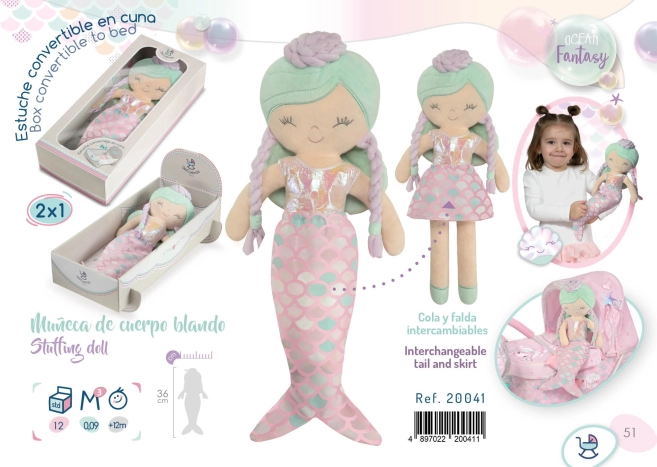 Die Plüschpuppe Ocean Fantasy aus der Kollektion 2021 wird jedes Mädchen mit ihrem wunderschönen spanischen Design bezaubern. Sie kommt mit einem Stoffüberzug, der den Meerjungfrauenschwanz darstellt, was die Verwandlung in ein Mädchen ermöglicht. Dieses multifunktionale Set enthält auch eine dekorative Geschenkschachtel, die in eine Wiege verwandelt werden kann.