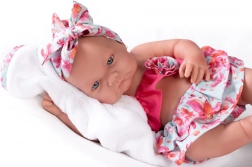 Ein florales Outfit mit passendem Haarband fördert das kreative Spiel. Die Puppe ist in einer eleganten Geschenkbox verpackt – die ideale Überraschung für kleine Puppeneltern.