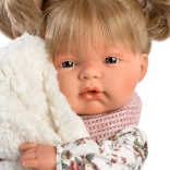 Willkommen in der Welt der spanischen Puppen Llorens, wo ein Spielzeug mehr ist als nur ein Spielzeug. Joelle ist eine 38 cm große Puppe, die ein elegantes weißes Kleid mit einem rosa Schal mit Bommeln trägt, ergänzt durch eine weiße Weste. Ihr blondes Haar ist zu zwei niedlichen Zöpfen gestylt.