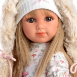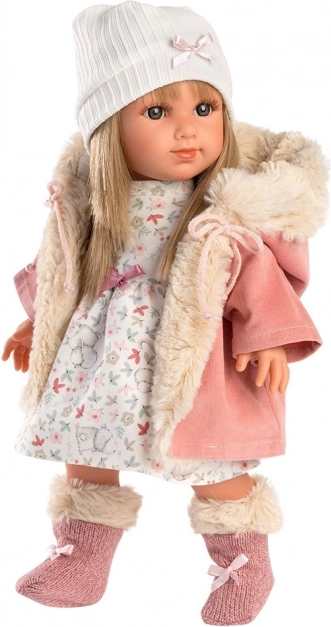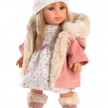 Mit Blick für Details und Qualität ist die Puppe Elena in einem rosa Mantel mit Pelzkragen und einem weißen Kleid mit Blumenmuster gekleidet.