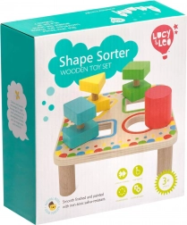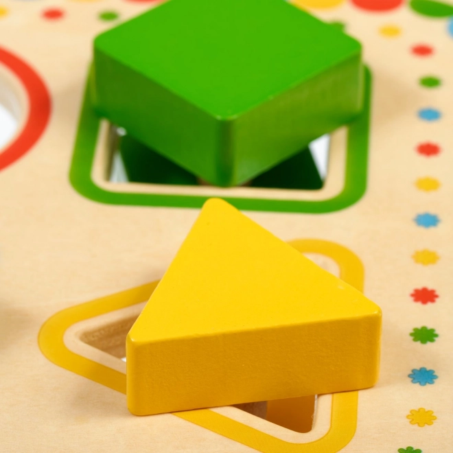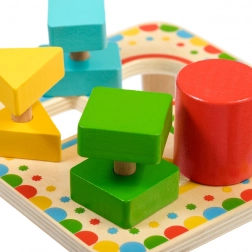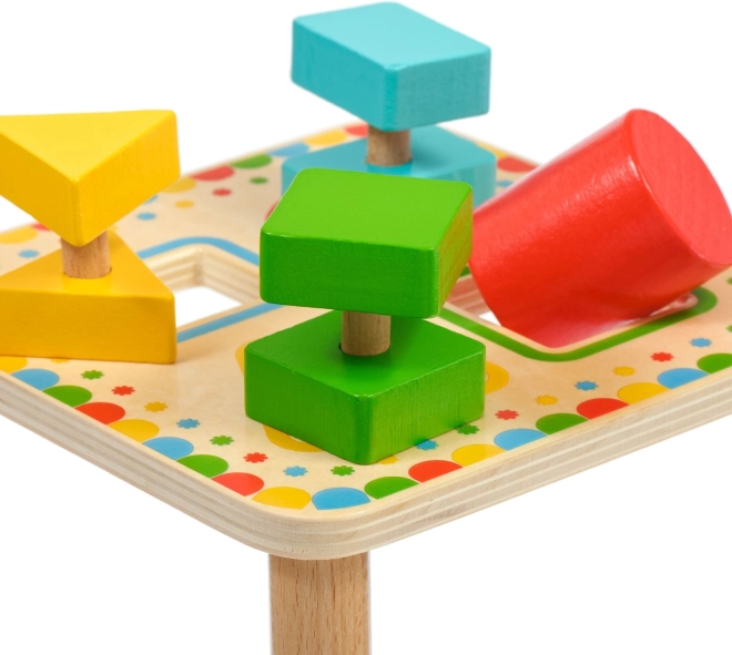 Die Platte auf stabilen Füßen verfügt über vier farbig umrahmte Öffnungen, die zu den Farben der einzelnen Teile passen. Das Set eignet sich ideal für das selbstständige Spiel ebenso wie für gemeinsames Entdecken mit Eltern und ist eine hervorragende pädagogische Holzspielzeug-Wahl für Vorschulkinder.